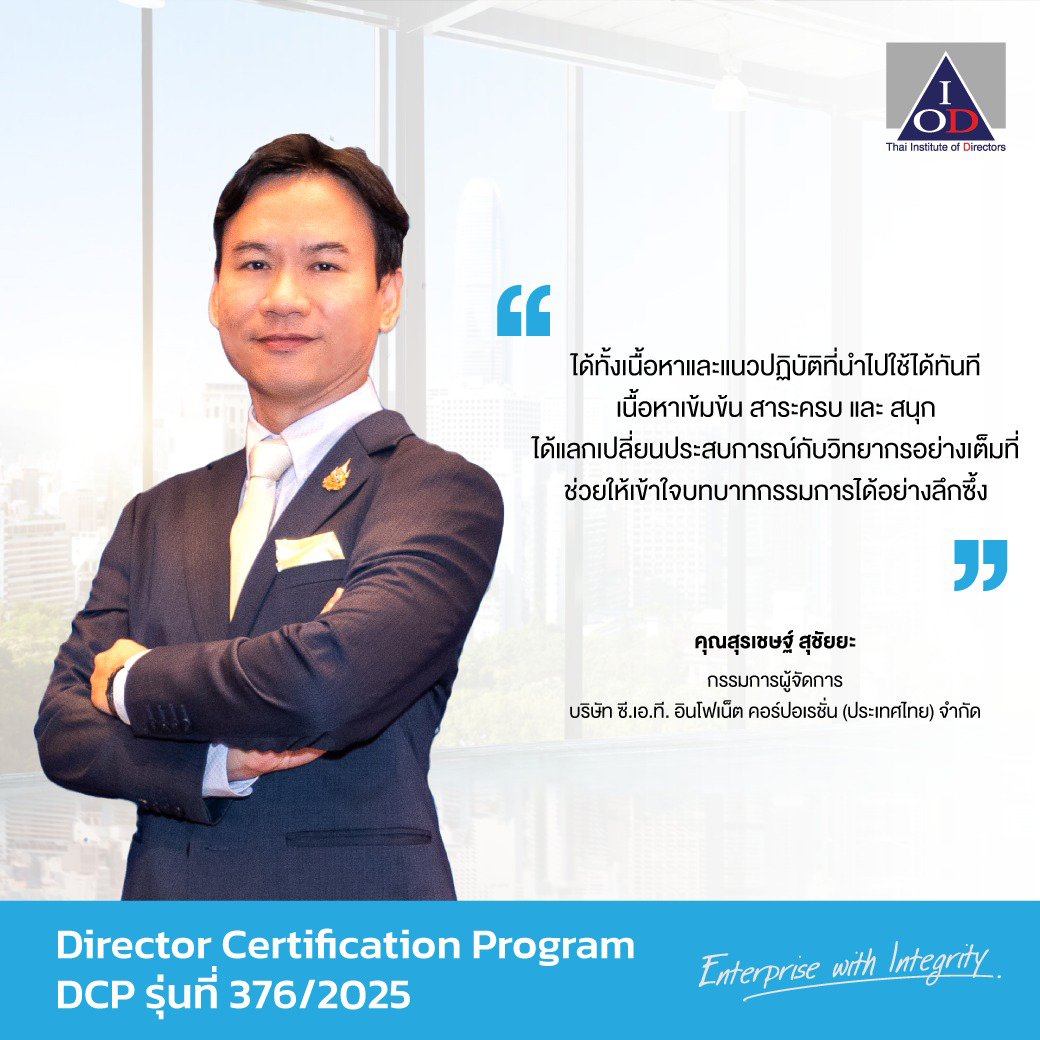 ขอบคุณ Thai IoD สำหรับการออกแบบหลักสูตรที่เข้มข้นและเปี่ยมด้วยคุณค่า รวมถึงการเปิดพื้นที่ให้เกิดการแลกเปลี่ยนมุมมองที่ลึกซึ้ง สร้างแรงบันดาลใจให้ผมก้าวต่ออย่างมีเป้าหมาย